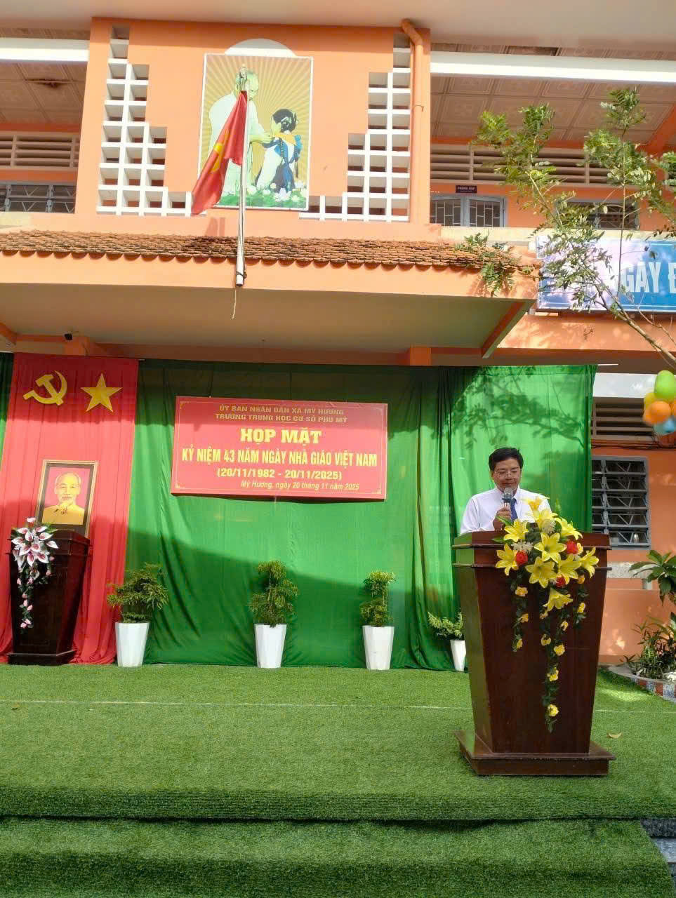 Sáng ngày 20/11/2025 tập thể Trường THCS Phú Mỹ long trọng tổ chức lễ kỉ niệm 43 năm ngày Nhà giáo Việt Nam. Đến dự có đồng chí Nguyễn Văn Út, phó bí thư thường trực đảng ủy xã Mỹ Hương là trưởng đoàn cùng tập thể giáo viên nhân viên nhà trường và hơn 600 học sinh nhà trường cùng tham dự.