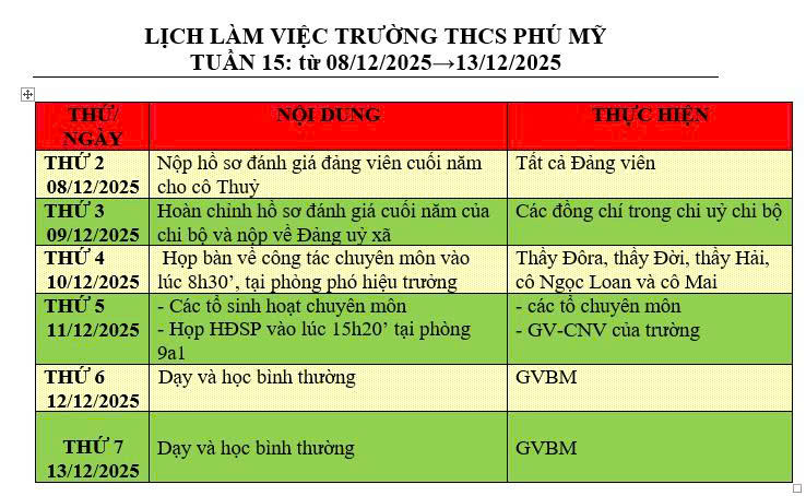 KẾ HOẠCH HOẠT ĐỘNG TUẦN 15