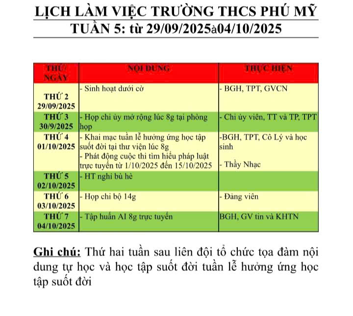 Lịch làm việc từ 29/09/2025 - 04/10/2025
